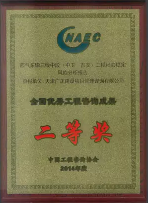 为了表彰和奖励在我国工程咨询业务中做出贡献的集体和个人,推动全国工程咨询业不断提高服务质量和水平,中国工程咨询协会组织开展了2014年度全国优秀工程咨询成果奖评奖工作。我公司《西气东输三线中段(中卫-吉安)工程社会稳定风险分析报告》项目,荣获中国工程咨询协会“2014年度全国优秀工程咨询成果二等奖”。