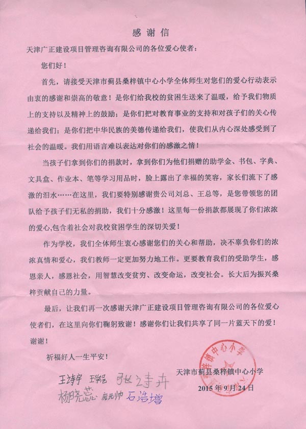 我公司爱心捐助蓟县桑梓镇中心小...[2017-05-27]我公司爱心捐助蓟县桑梓镇中心小学贫困儿童2015年1月15日上午,我公司董事长刘弘先生带领由股东们及各部门经理组成的爱心团队,携带爱心捐助物品到达蓟县桑梓镇中心小学,并在当地镇长、村支书和校长的陪同下,向学校的...阅读更多+