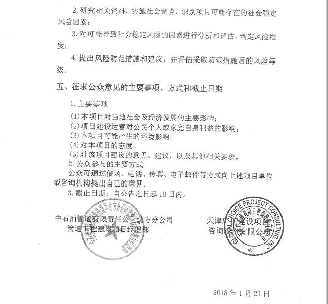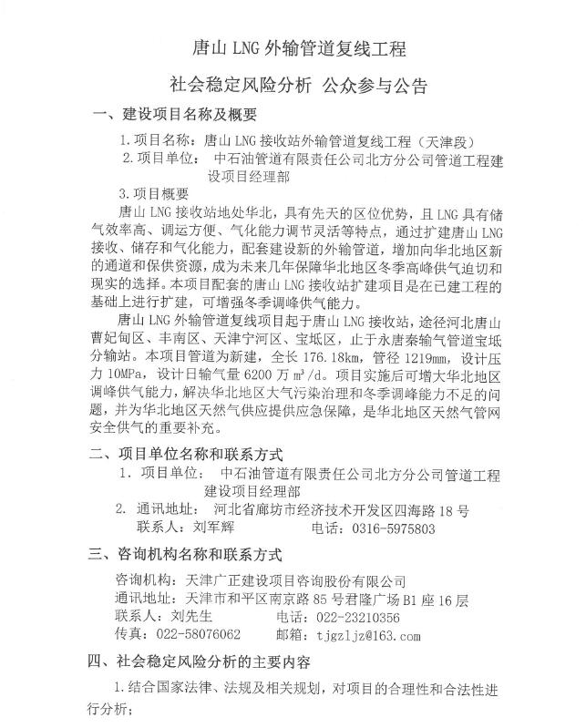 唐山LNG外输管道复线工程社会稳定风险分析公众参与公告(天津段)