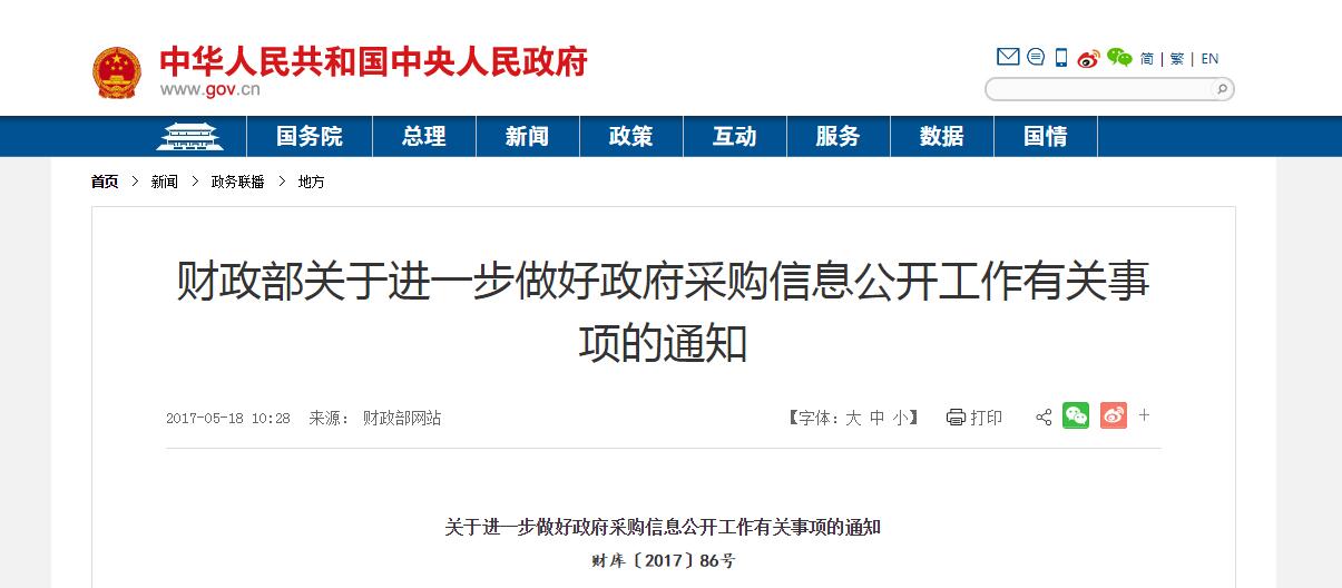 财政部关于进一步做好政府采购信息公开工作有关事项的...财政部关于进一步做好政府采购信息公开工作有关事项的通知财库〔2017〕86号党中央有关部门,国务院各部委、各直属机构,全国人大常委会办公厅,全国政协办公厅,高法院,高检院,各民主党派中央,有关人民团体,各省、自治区、直辖市、计划单列市财政厅(局),新疆生产建设兵团财务局: 近年来,各地区、各部门落实建立政府采购全过程信息公开...阅读更多+ - 05-242017