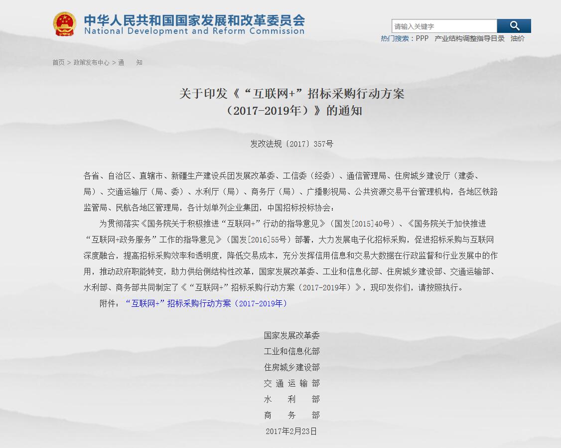 国家发展改革委会同有关部门印发《“互联网+”招标采购行...国家发展改革委会同有关部门印发《“互联网+”招标采购行动方案(2017-2019年)》为贯彻落实《国务院关于积极推进“互联网+”行动的指导意见》(国发[2015]40号)、《国务院关于加快推进“互联网+政务服务”工作的指导意见》(国发[2016]55号)部署,大力发展电子化招标采购,促进招标采购与互联网深度融合,提高招标采购效率和透明度,降低交易成...阅读更多+